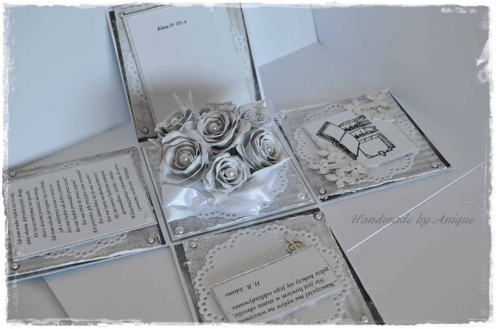 Dziś przedstawiam exploding box'a jako podziękowanie dla wychowawcy od klasy po 4 latach nauki w szkole średniej. Z wierzchu pudełeczko jest w odcieniach niebieskiego, a w środku w odcieniach szarości i srebra. Zdobią je ręcznie robione kwiatki, perełki, wycinanki, tekturki, tiul, koronka i wstążki.
