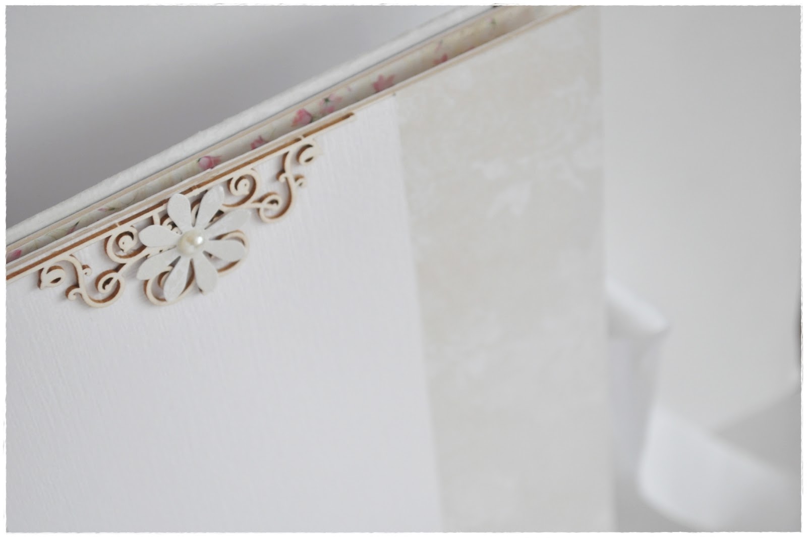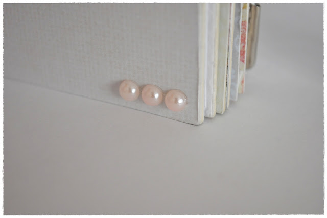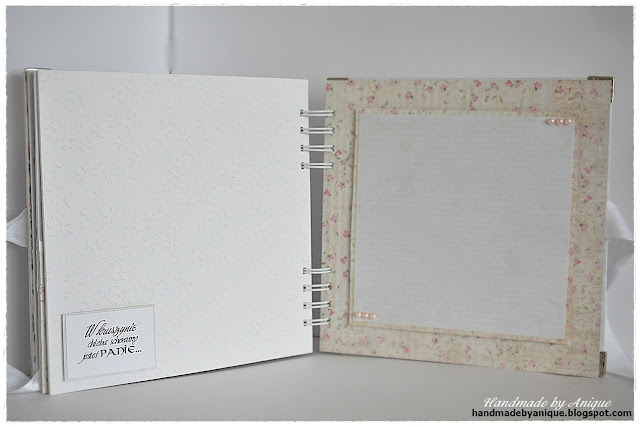 Album składa się z 7 kart, mieszczących 14 zdjęć formatu 10x15 (tak będzie prezentować się najlepiej) lub 13x18, w ułożeniu pionowym lub poziomym - jak kto woli. Na okładce można wpisać lub wkleić dedykację albo poświęcić to miejsce na dodatkowe zdjęcie. Utrzymany jest w kolorystyce beżowo-kremowo-białej z akcentami różu, ponieważ wykonany został dla dziewczynki :) Ozdobiony tekturkami, perełkami, wstążką i kwiatkami. Znalazł się w nim także kielich - digi stempel autorstwa Alicji Malon. Do wykonania albumu użyłam głównie kolekcji papierów List Miłosny, odrobinę Mademoiselle oraz papieru wizytówkowego z fakturą, a także tłoczonego w eleganckie roślinne motywy papieru firmy Heyda. Mam nadzieję, że przypadnie do gustu obdarowanej :)