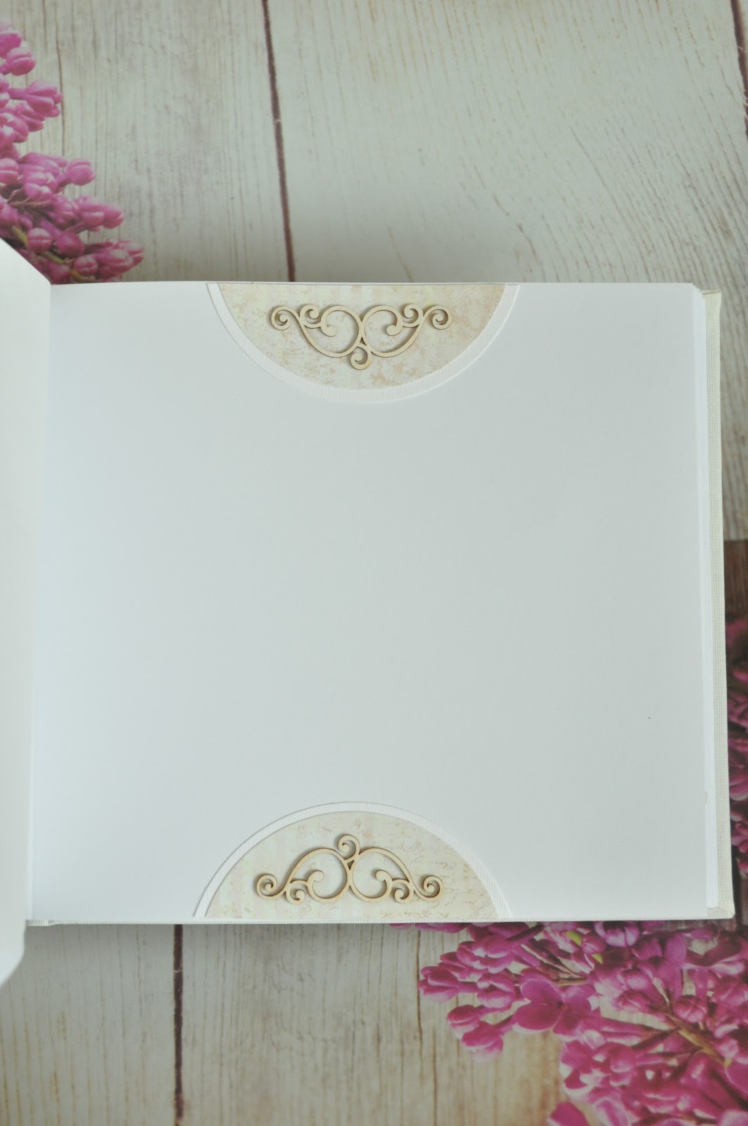 Baza eco - scrapbooking. Wymiary albumu około 17 x 22 cm. Składa się z 25 kart, na 10 jednakowo zdobionych kartach miejsce na wpisy gości, pozostałe 15 kart to miejsce przeznaczone na zdjęcie. Wszystkie karty delikatnie zdobione - stemplami, kwiatami, tekturkami.