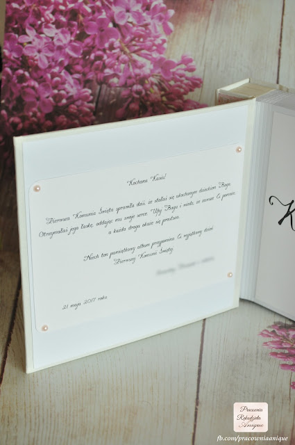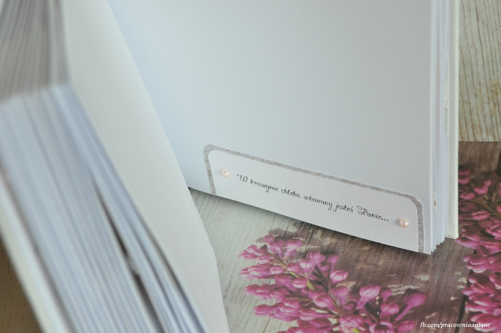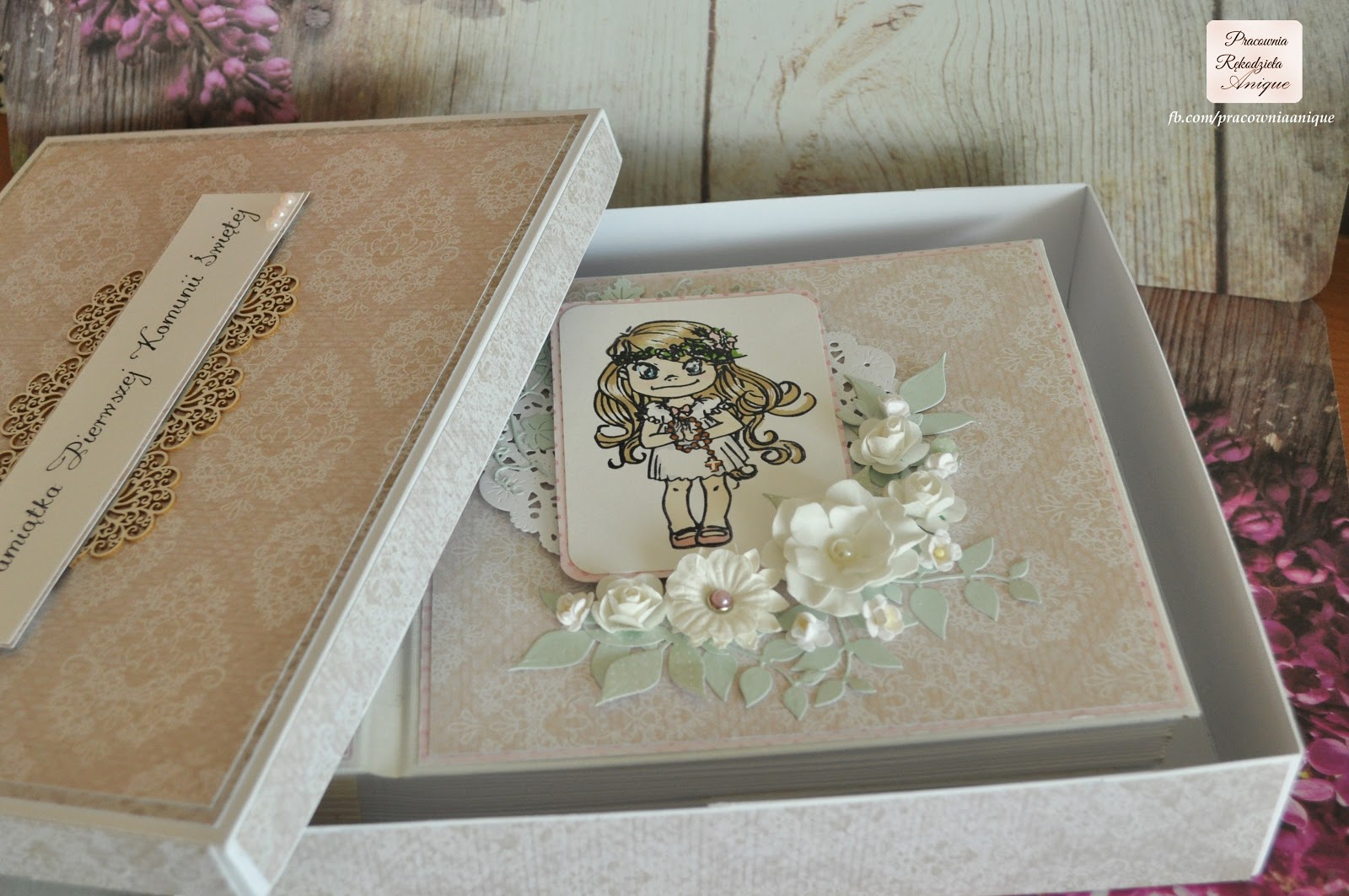 Na okładce "komunijna dziewczynka" - stempel wyembossowany i malowany ręcznie promarkerami. Oraz kompozycja kwiatowa.