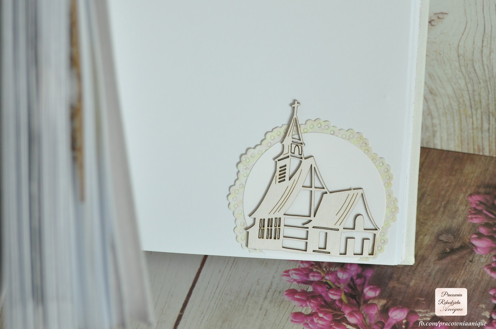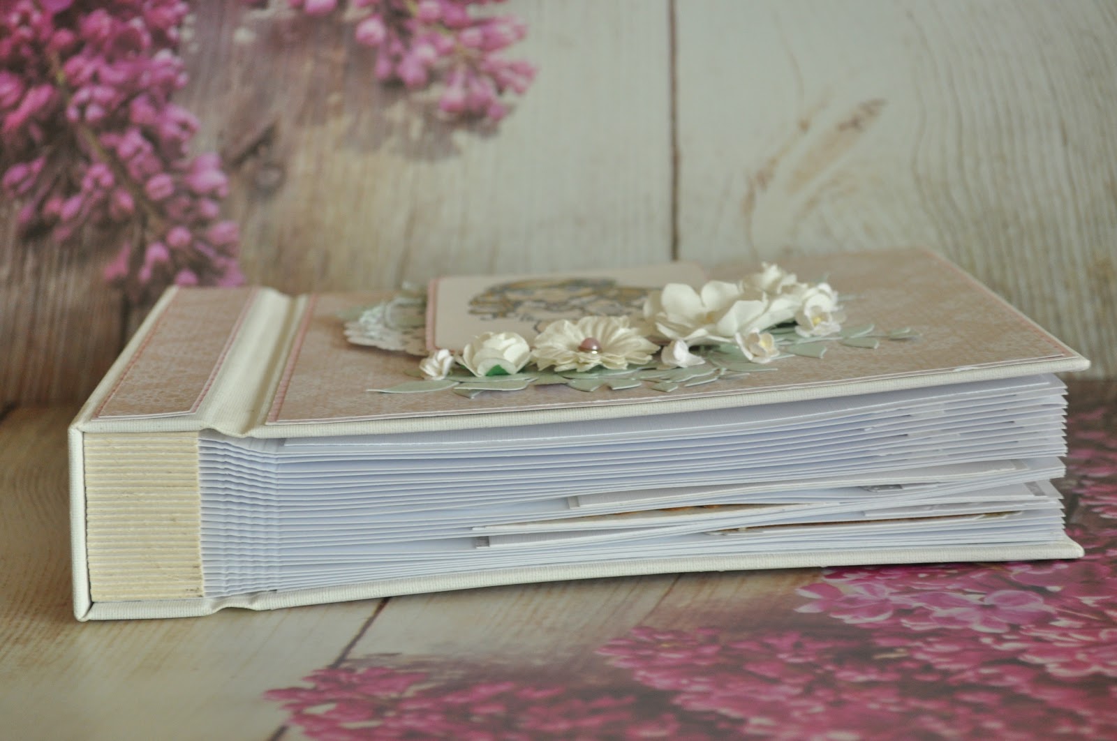 Baza eco - scrapbooking. Wymiary albumu około 17 x 22 cm. Składa się z 25 kart, na 10 jednakowo zdobionych kartach miejsce na wpisy gości, pozostałe 15 kart to miejsce przeznaczone na zdjęcie. Wszystkie karty delikatnie zdobione - stemplami, kwiatami, tekturkami.