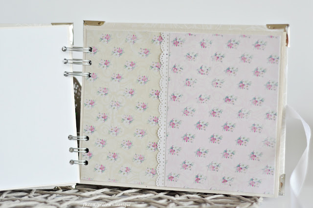 Całość delikatnie zdobiona, w kolorach kremowych z akcentami różu.