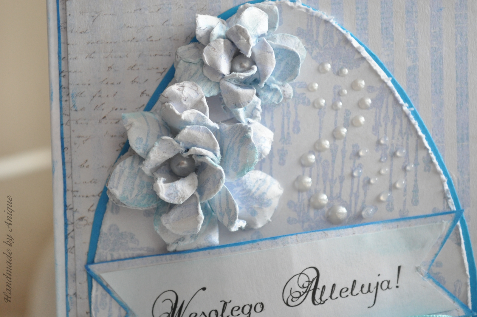 Wielkanocna kartka calutka w niebieskościach. I własnoręcznie robione kwiatki, do których dopiero powoli się przekonuję. To dość nietypowy kolor jak na Wielkanocne kartki, ale czemu by nie spróbować :)