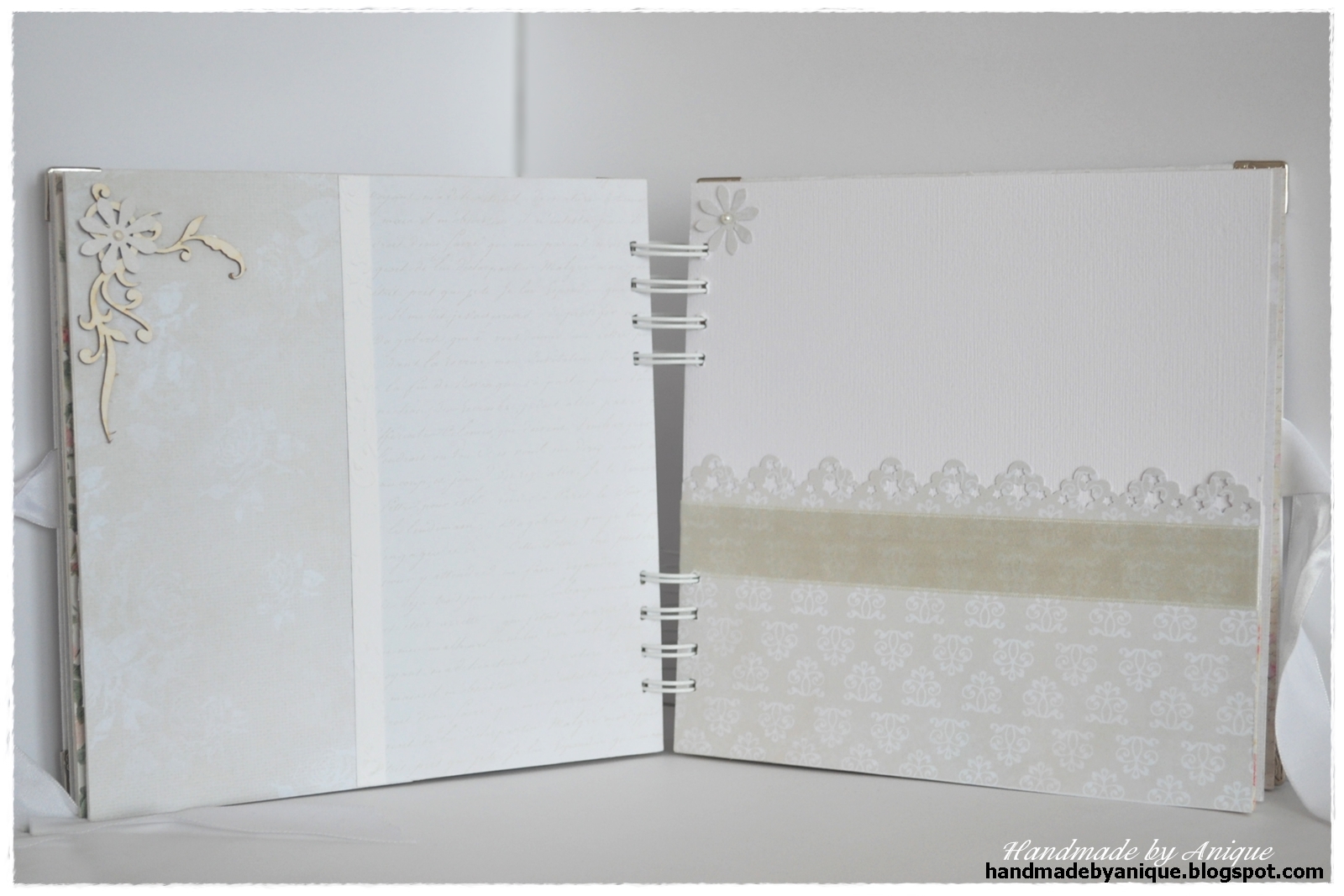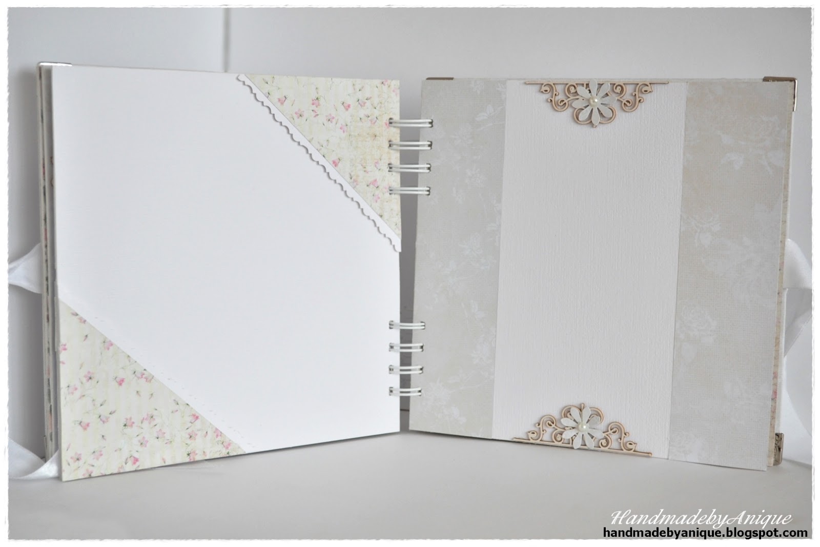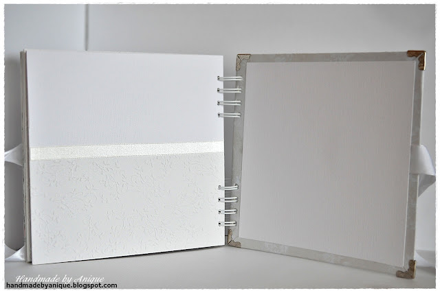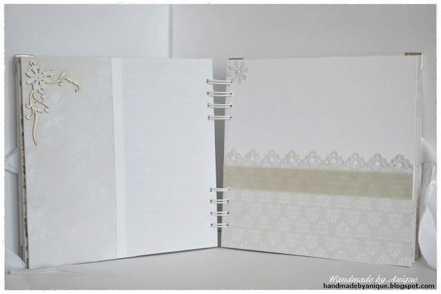 Album składa się z 7 kart, mieszczących 14 zdjęć formatu 10x15 (tak będzie prezentować się najlepiej) lub 13x18, w ułożeniu pionowym lub poziomym - jak kto woli. Na okładce można wpisać lub wkleić dedykację albo poświęcić to miejsce na dodatkowe zdjęcie. Utrzymany jest w kolorystyce beżowo-kremowo-białej z akcentami różu, ponieważ wykonany został dla dziewczynki :) Ozdobiony tekturkami, perełkami, wstążką i kwiatkami. Znalazł się w nim także kielich - digi stempel autorstwa Alicji Malon. Do wykonania albumu użyłam głównie kolekcji papierów List Miłosny, odrobinę Mademoiselle oraz papieru wizytówkowego z fakturą, a także tłoczonego w eleganckie roślinne motywy papieru firmy Heyda. Mam nadzieję, że przypadnie do gustu obdarowanej :)
