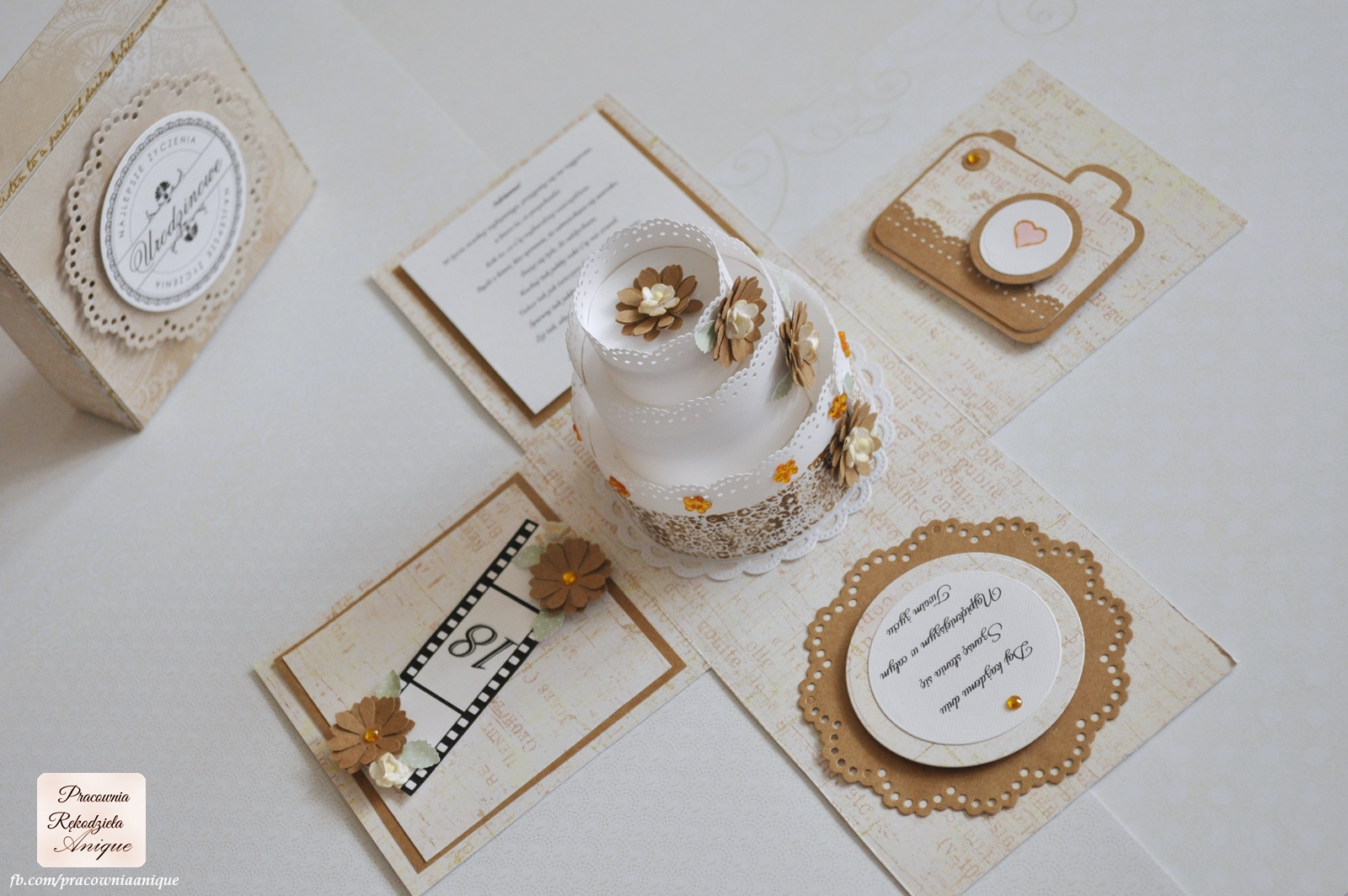 Baza eco - scrapbooking. Wymiary albumu około 17 x 22 cm. Składa się z 25 kart, na 10 jednakowo zdobionych kartach miejsce na wpisy gości, pozostałe 15 kart to miejsce przeznaczone na zdjęcie. Wszystkie karty delikatnie zdobione - stemplami, kwiatami, tekturkami.