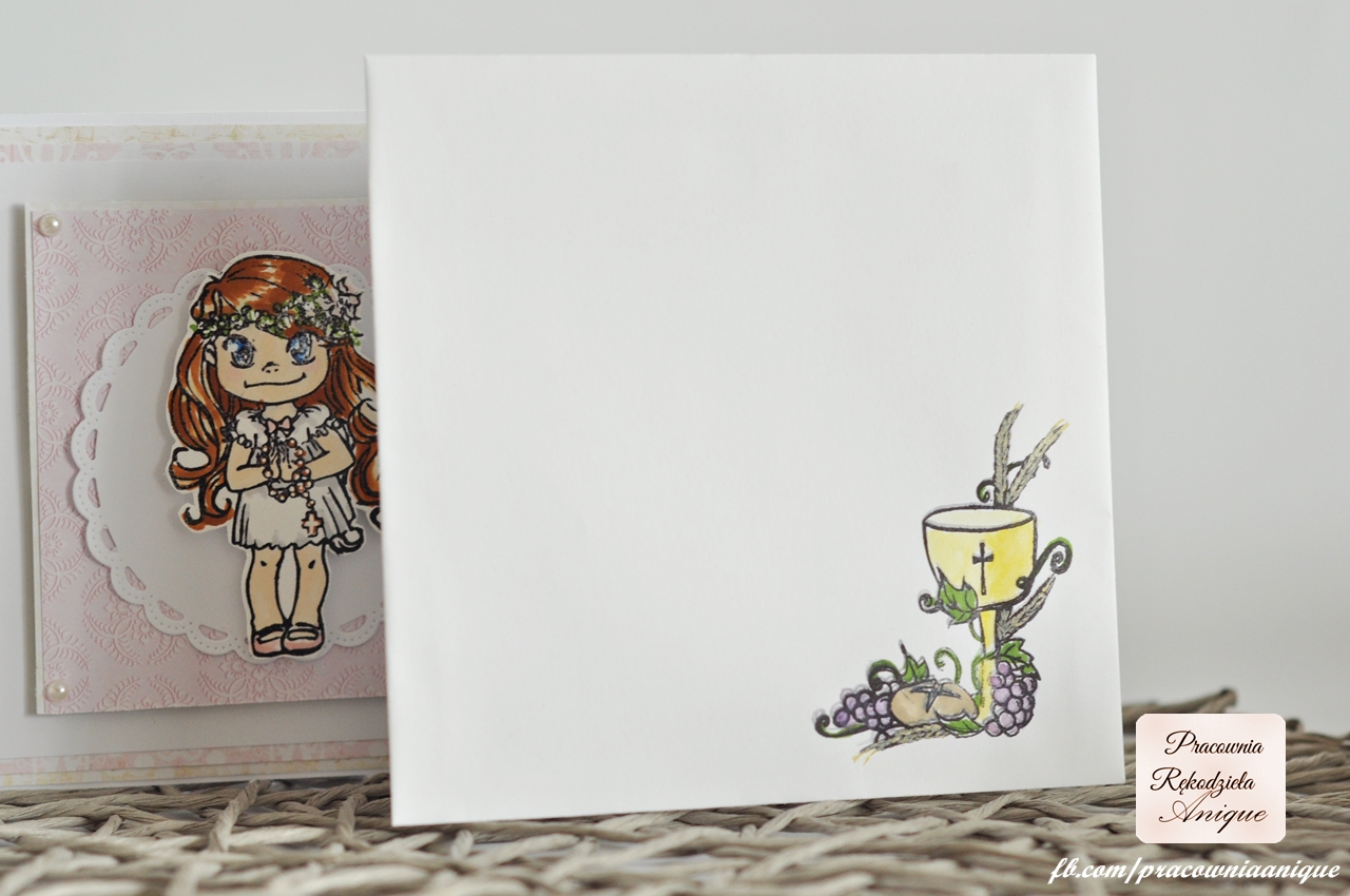 Ze stemplem Agterii, pokolorowanym promarkerami i kredkami akwarelowymi. Listki także pomalowane. Dodatkowo ręcznie robione kwiaty.